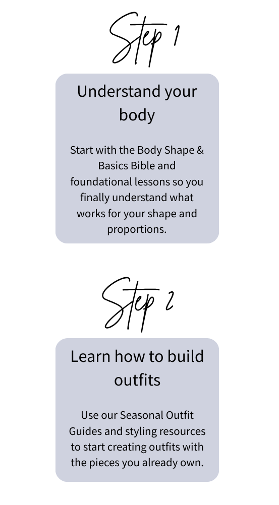 It’s an online community where women learn the skills, strategies and confidence to build wardrobes that actually work for their bodies and their lives. With me guiding you every step of the way.Â